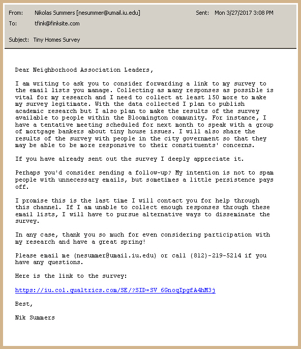 Nikolas Summers of Indiana University is conducting a survey to assess Neighborhood attitudes towards Tiny Houses. Want to voice your opinion? You can, at: